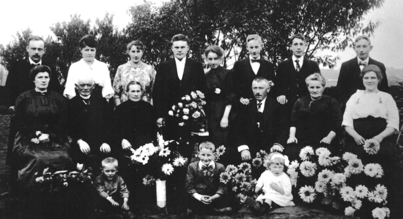Foto van het Huwelijk van Jan Leijten en Nel van Dijk 1920. Op de bovenste rij van links naar rechts: ?, ?, Marie (M.J.C. 1.1.3) van Dijk, Jan Leijten, Nel (P.A 1.1.2) van Dijk,Harry (H.N.J. 1.1.5) van Dijk, Jan (J.C. 1.1.4) van Dijk,Nico (N.C. 1.1) van Dijk. Op de middelste rij, ? dan de ouders van Jan Leijten, Cornelus (C.1.1.) van Dijk en zijn vrouw Miena (Wilhelmina Lucia) van Dijk-Smulders. Daarnaast de eerste vrouw van Nico van Dijk, Rika Sofia van Dijk-Scholten . De onderste rij Christ (Q.P.C. 1.1.7) van Dijk,Cees (H.C 1.1.6) van Dijk en Luus (W.J.P 1.1.1.1.) van Dijk dochter van Nico en Rika. |
